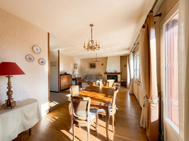 La maison développe un espace de vie lumineux organisé autour d’un séjour exposé plein sud, profitant d’une excellente luminosité naturelle. Plus largement, l’habitation bénéficie de quatre expositions, apportant confort et clarté à chaque moment de la journée.